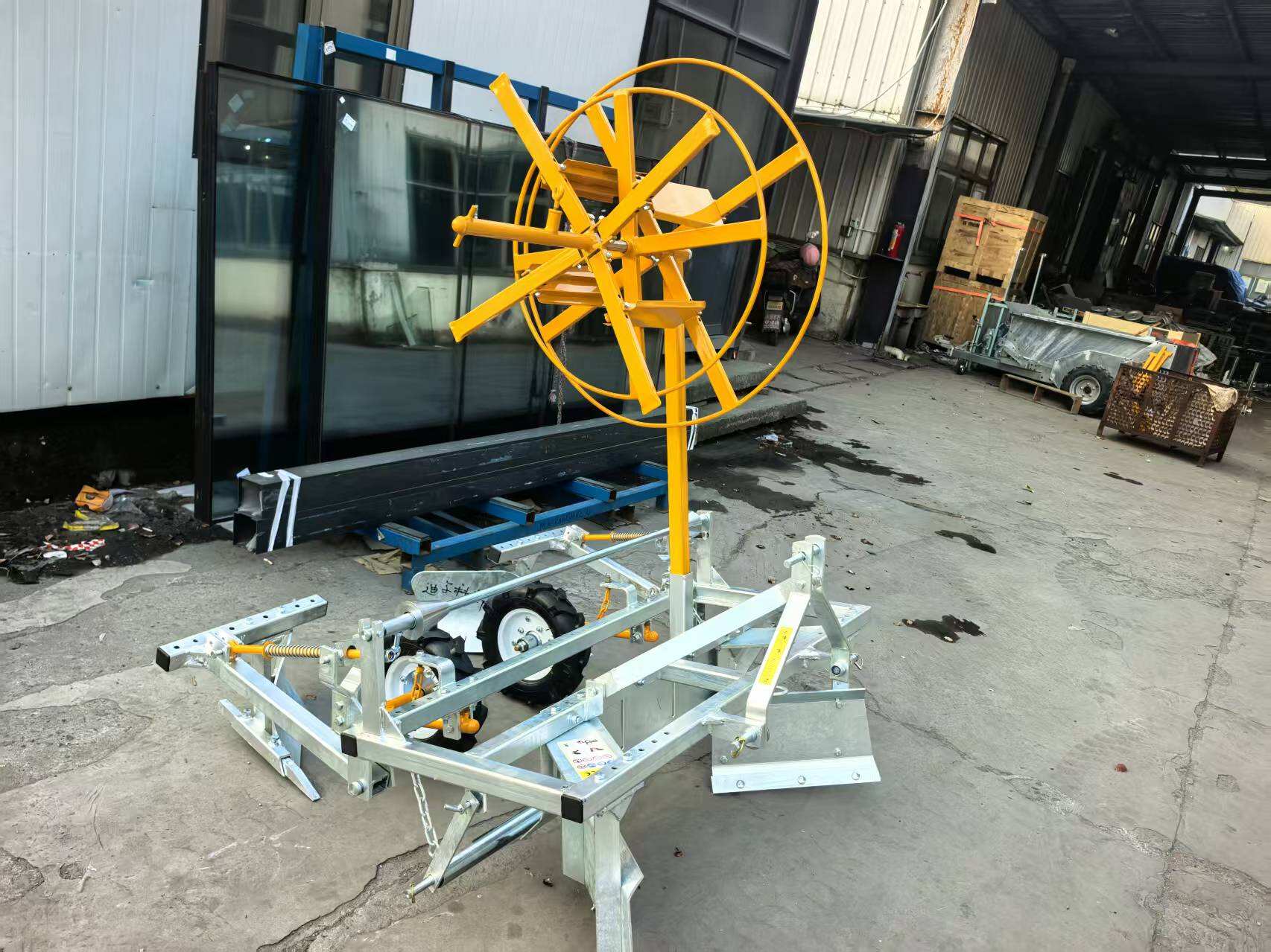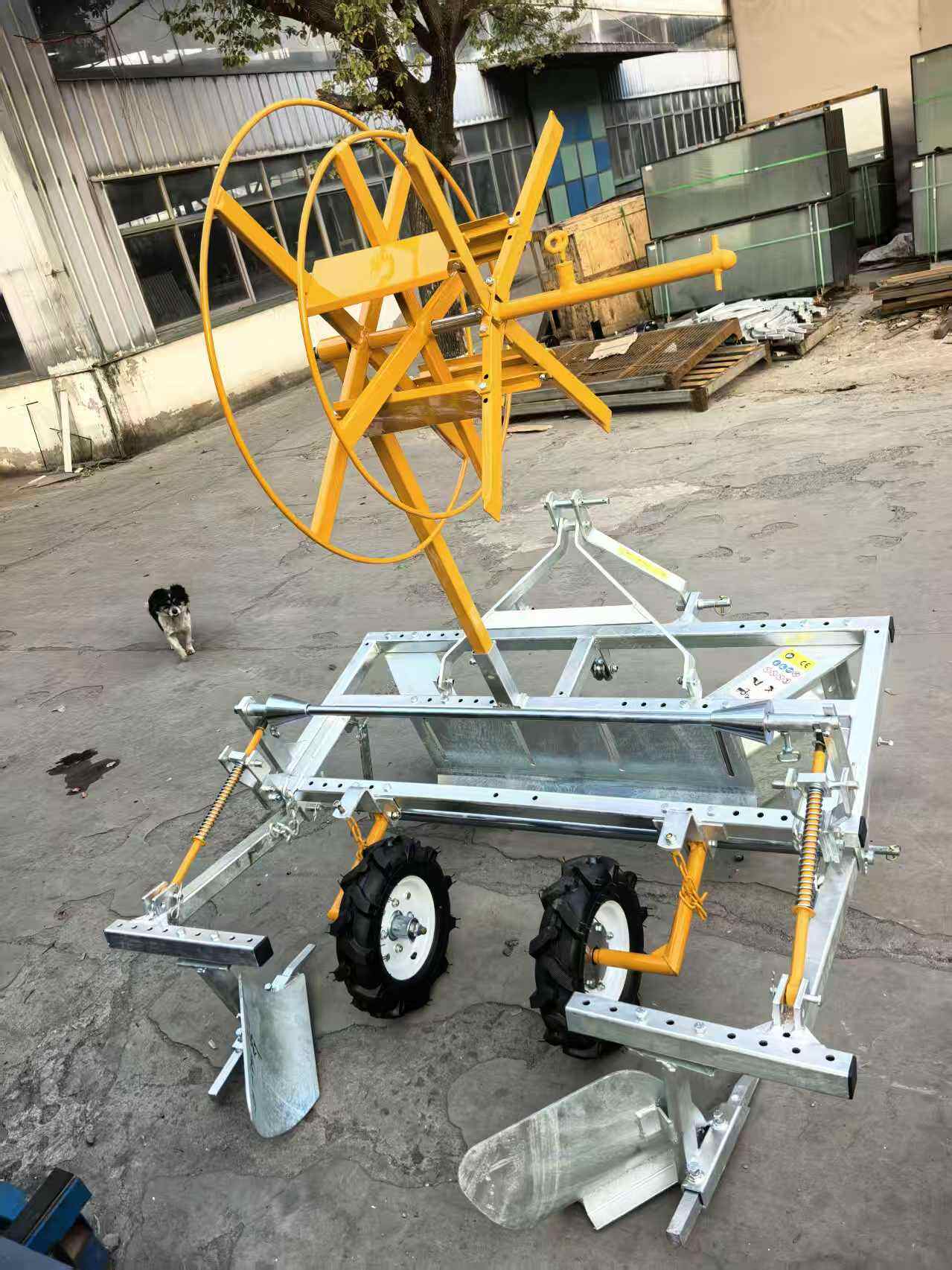 La machine peut poser un film de paillage de 1,0 m à 1,2 m de largeur ; les colliers de fixation sont ajustables sur la tige du support de film.